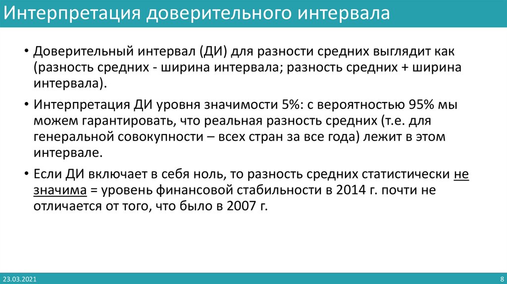 Интерпретация доверительного интервала• Доверительный интервал (ДИ) для разности средних выглядит как