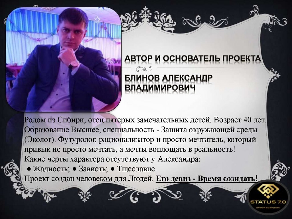 Проект создан человеком для Людей. Его девиз - Время созидать!