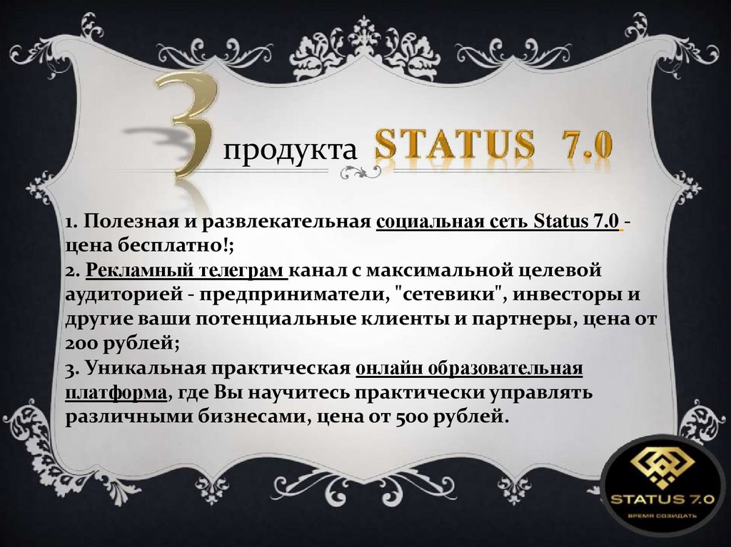 продукта1. Полезная и развлекательная социальная сеть Status 7.0 цена бесплатно!;
