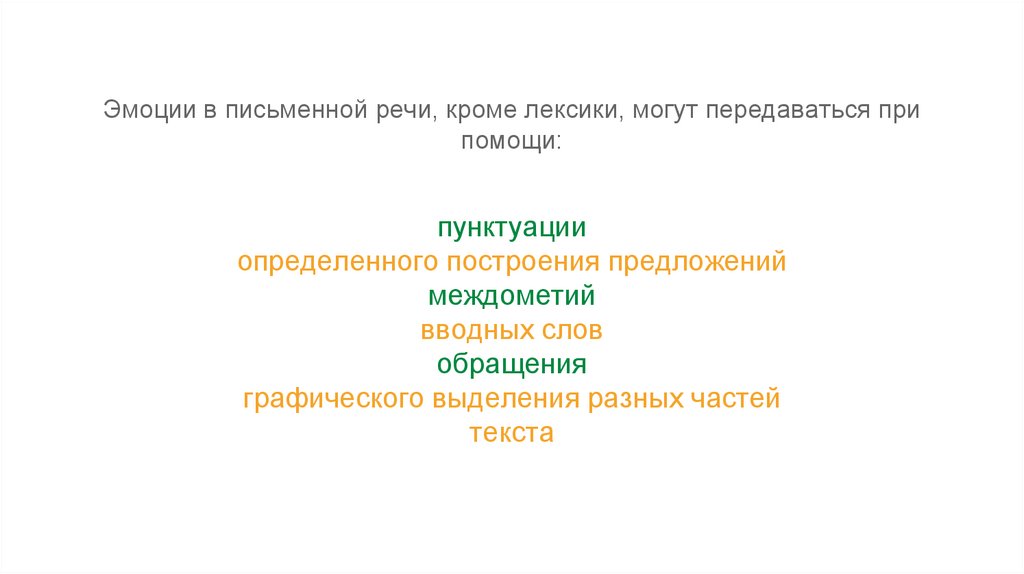 Эмоции в письменной речи, кроме лексики, могут передаваться припомощи: