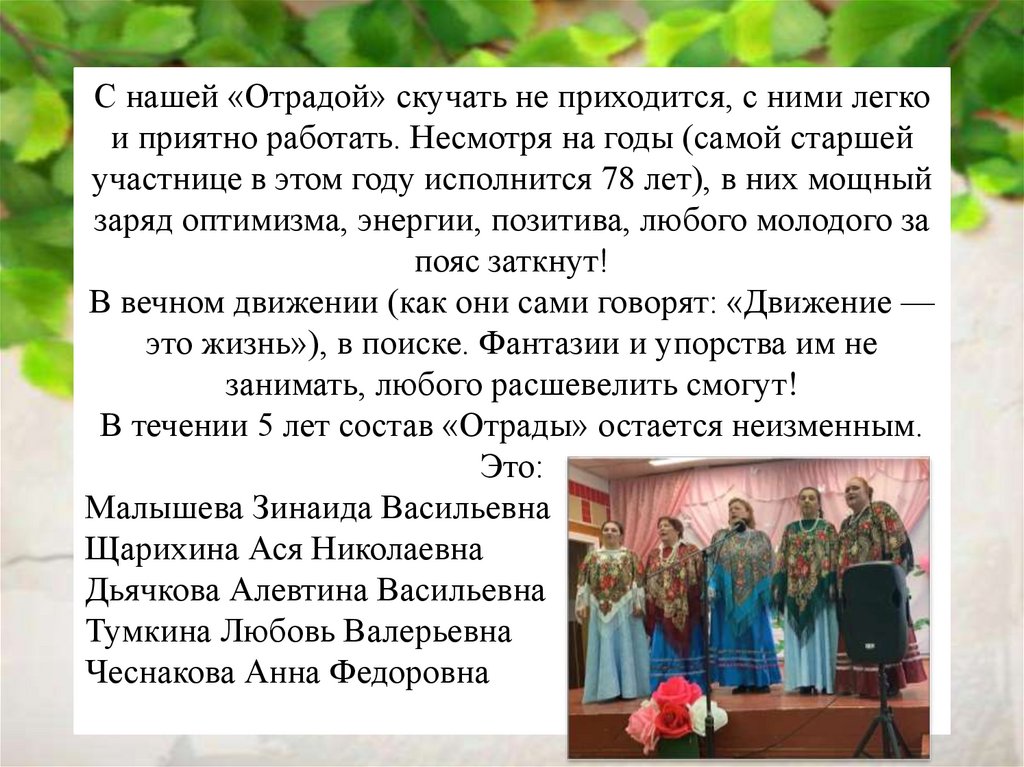 С нашей «Отрадой» скучать не приходится, с ними легкои приятно работать. Несмотря на годы (самой старшей