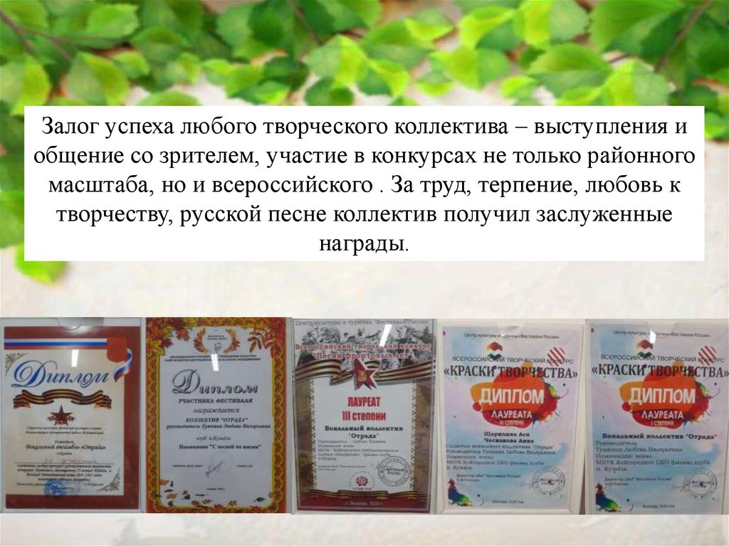 Залог успеха любого творческого коллектива – выступления иобщение со зрителем, участие в конкурсах не только районного