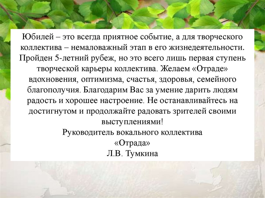 Юбилей – это всегда приятное событие, а для творческогоколлектива – немаловажный этап в его жизнедеятельности.