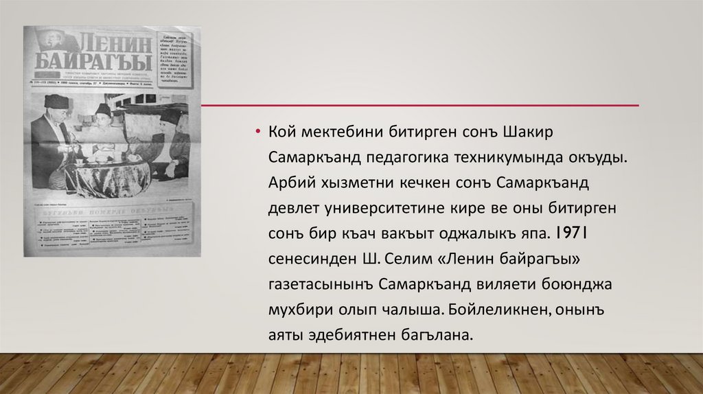 • Кой мектебини битирген сонъ ШакирСамаркъанд педагогика техникумында окъуды.