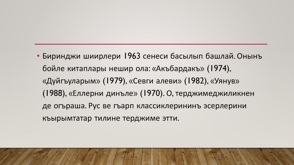 • Биринджи шиирлери 1963 сенеси басылып башлай. Онынъбойле китаплары нешир ола: «Акъбардакъ» (1974),