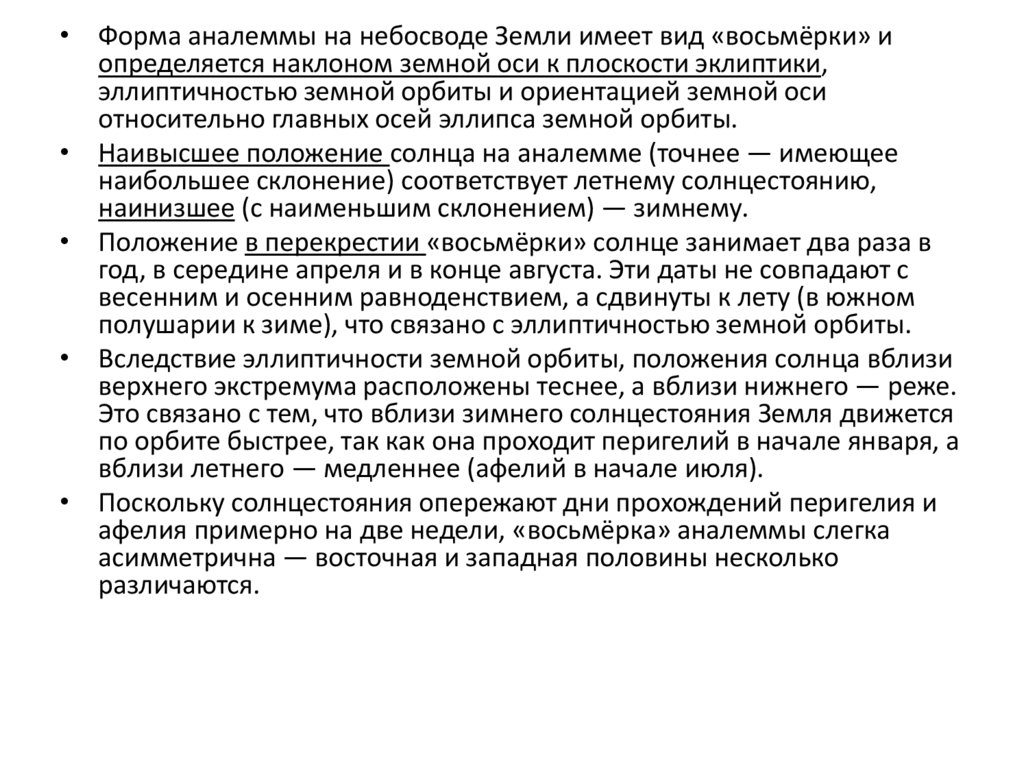 • Форма аналеммы на небосводе Земли имеет вид «восьмёрки» иопределяется наклоном земной оси к плоскости эклиптики,