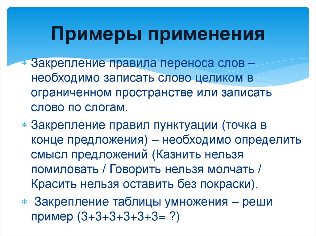 Примеры примененияЗакрепление правила переноса слов –
