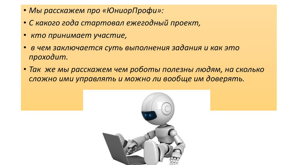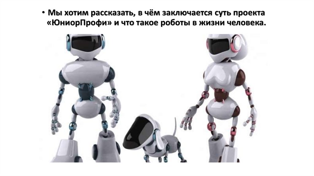 • Мы хотим рассказать, в чём заключается суть проекта«ЮниорПрофи» и что такое роботы в жизни человека.