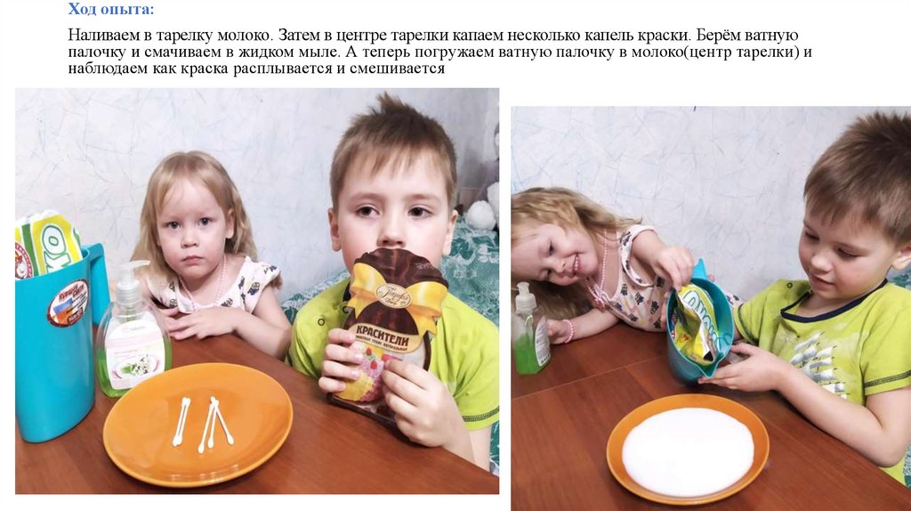 Ход опыта:Наливаем в тарелку молоко. Затем в центре тарелки капаем несколько капель краски. Берём ватную
