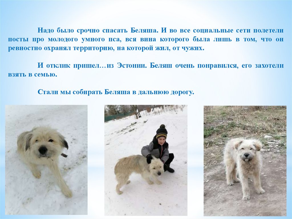 Надо было срочно спасать Беляша. И во все социальные сети полетелипосты про молодого умного пса, вся вина которого была лишь в том, что он