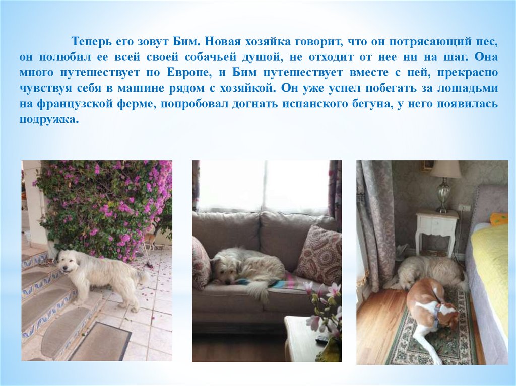 Теперь его зовут Бим. Новая хозяйка говорит, что он потрясающий пес,он полюбил ее всей своей собачьей душой, не отходит от нее ни на шаг. Она