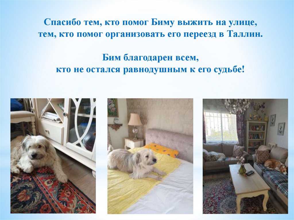 Спасибо тем, кто помог Биму выжить на улице,тем, кто помог организовать его переезд в Таллин.