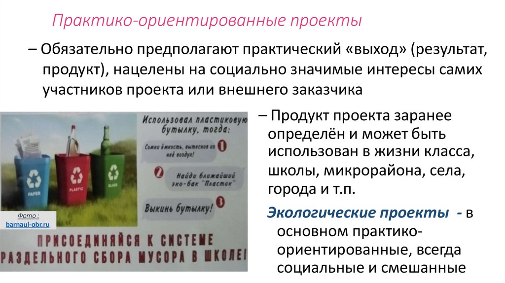 Практико-ориентированные проекты– Обязательно предполагают практический «выход» (результат,