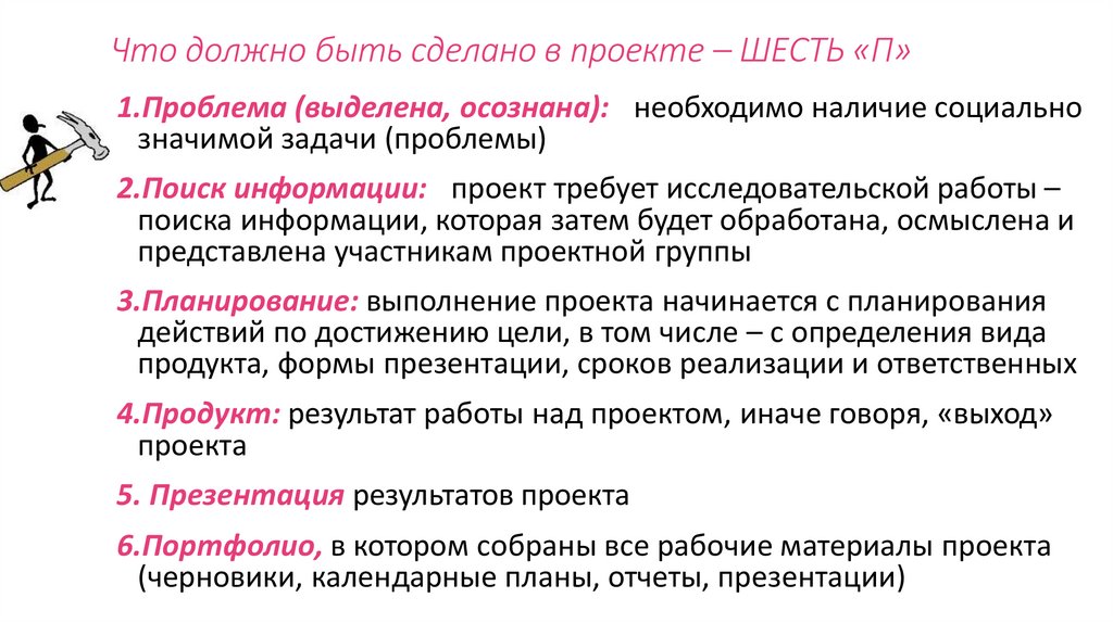 Что должно быть сделано в проекте – ШЕСТЬ «П»1.Проблема (выделена, осознана): необходимо наличие социально