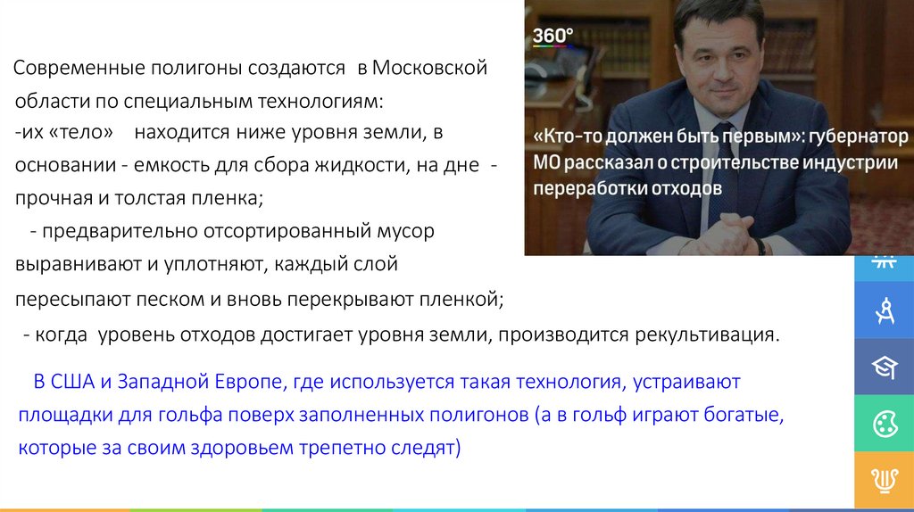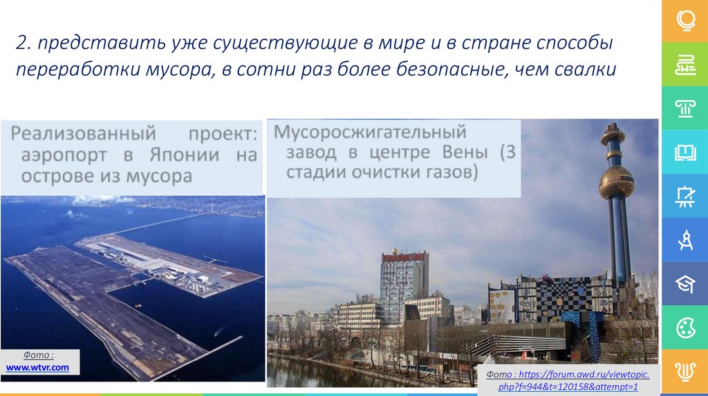 2. представить уже существующие в мире и в стране способыпереработки мусора, в сотни раз более безопасные, чем свалки