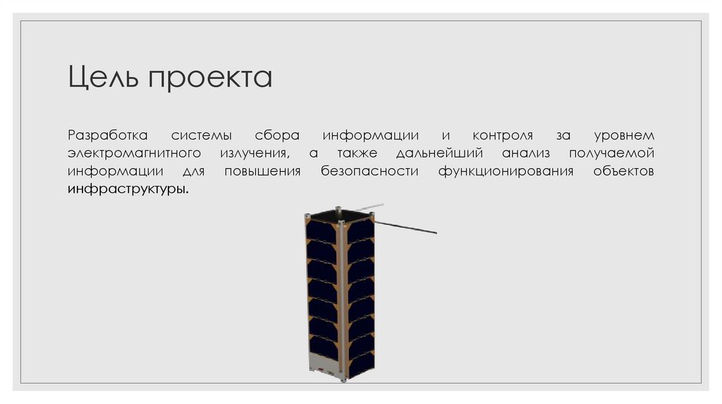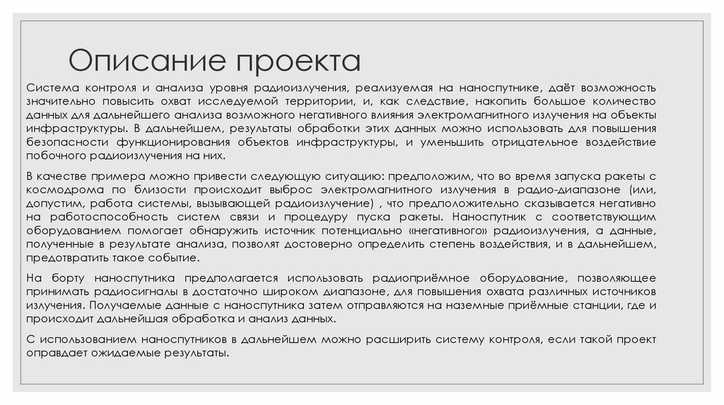 Описание проектаСистема контроля и анализа уровня радиоизлучения, реализуемая на наноспутнике, даёт возможность