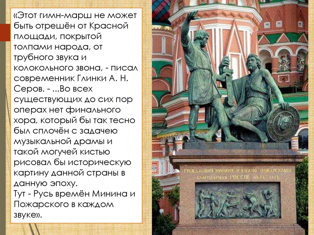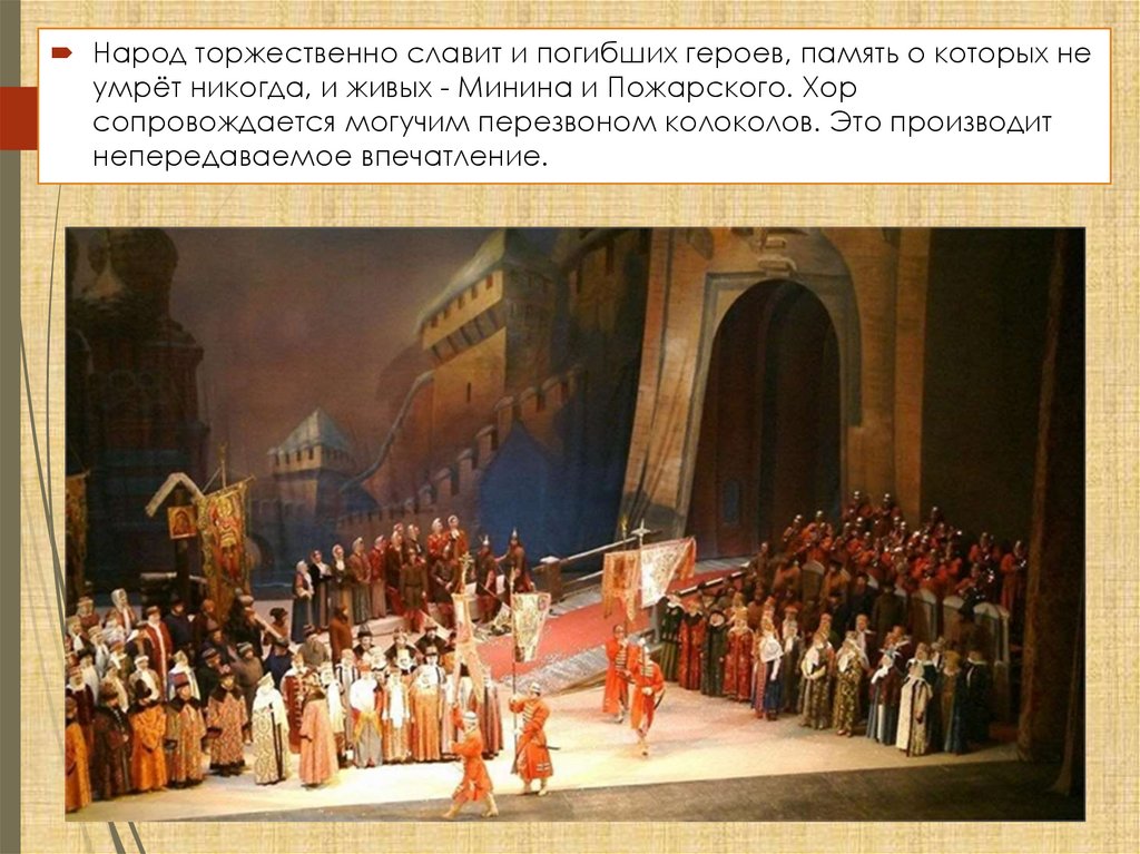 Народ торжественно славит и погибших героев, память о которых неумрёт никогда, и живых - Минина и Пожарского. Хор