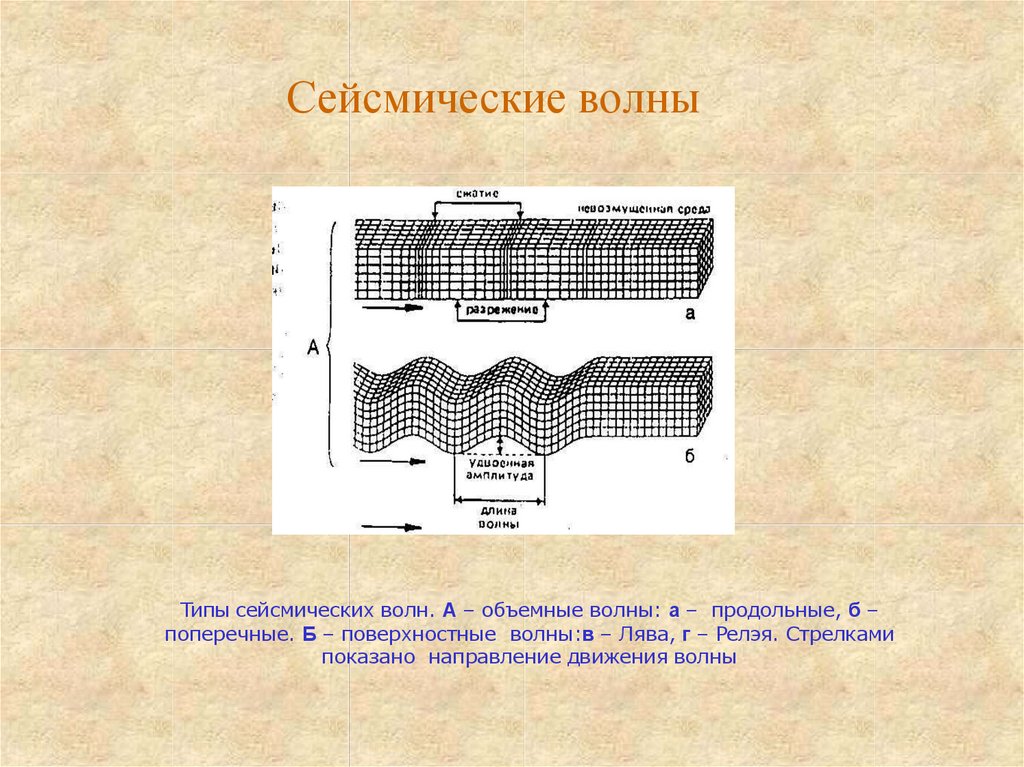 Сейсмические волныТипы сейсмических волн. А – объемные волны: а – продольные, б –