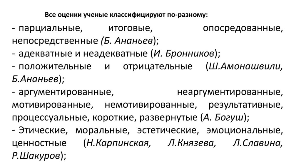 Все оценки ученые классифицируют по-разному:- парциальные,