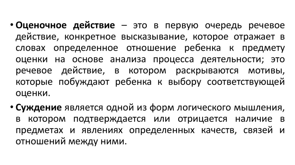 • Оценочное действие – это в первую очередь речевоедействие, конкретное высказывание, которое отражает в