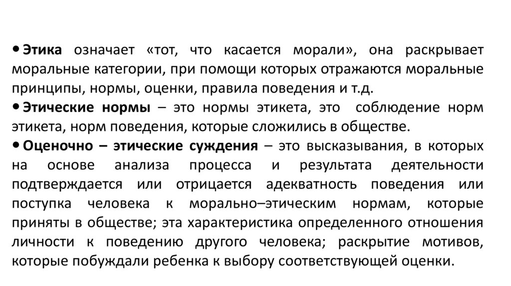 Этика означает «тот, что касается морали», она раскрываетморальные категории, при помощи которых отражаются моральные