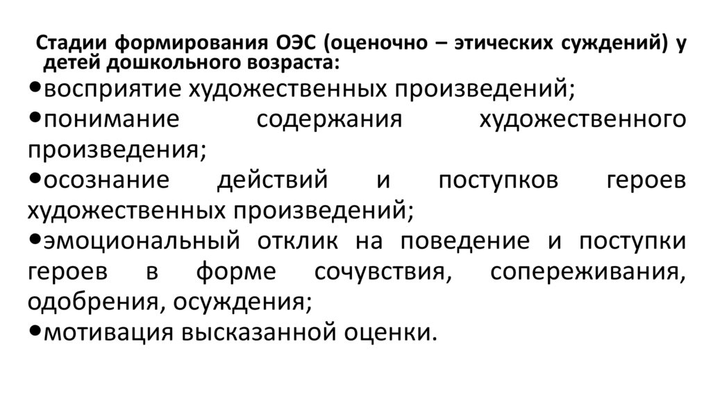 Стадии формирования ОЭС (оценочно – этических суждений) удетей дошкольного возраста: