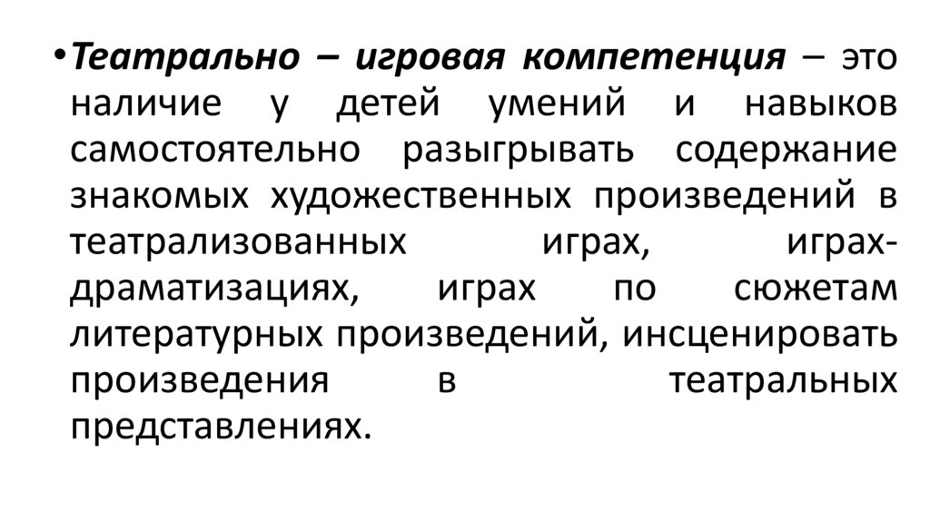 •Театрально – игровая компетенция – этоналичие у детей умений и навыков