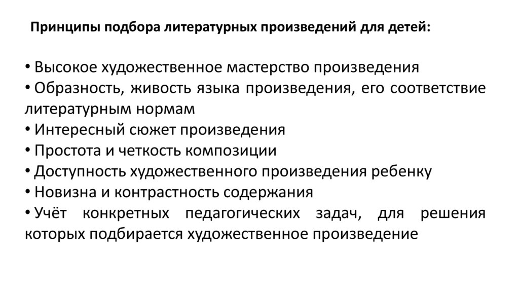Принципы подбора литературных произведений для детей:• Высокое художественное мастерство произведения
