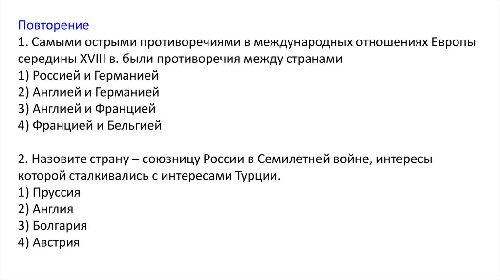 Повторение1. Самыми острыми противоречиями в международных отношениях Европы