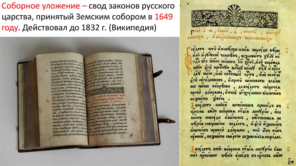 Соборное уложение – свод законов русскогоцарства, принятый Земским собором в 1649