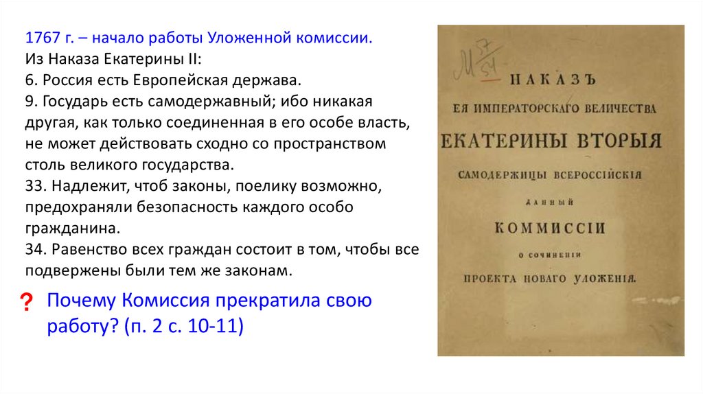 1767 г. – начало работы Уложенной комиссии.Из Наказа Екатерины II: