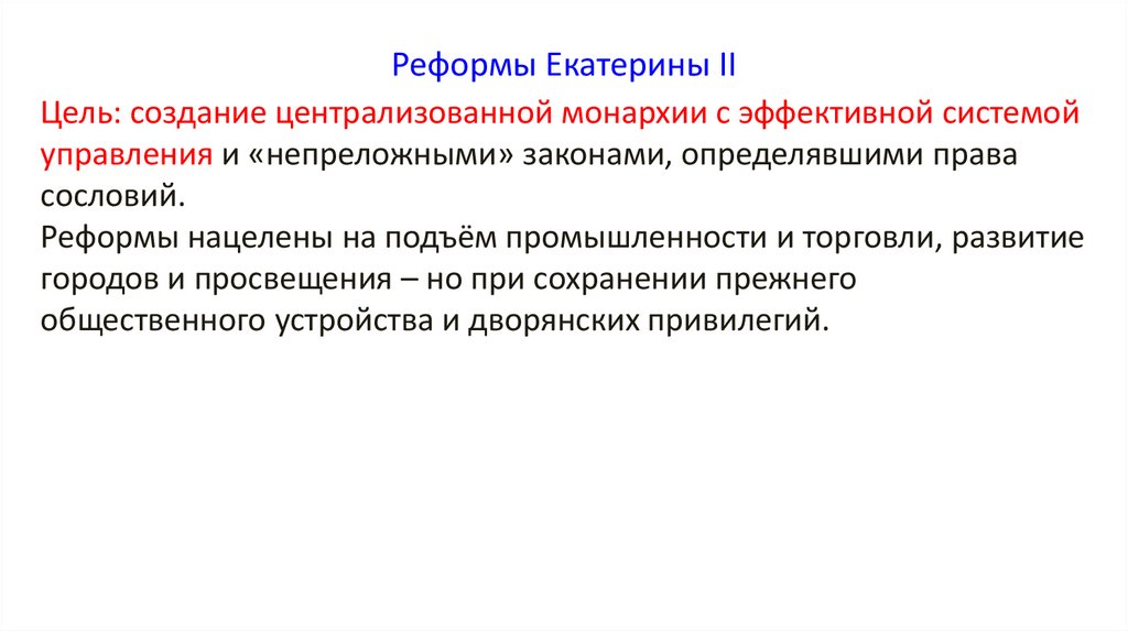 Реформы Екатерины IIЦель: создание централизованной монархии с эффективной системой