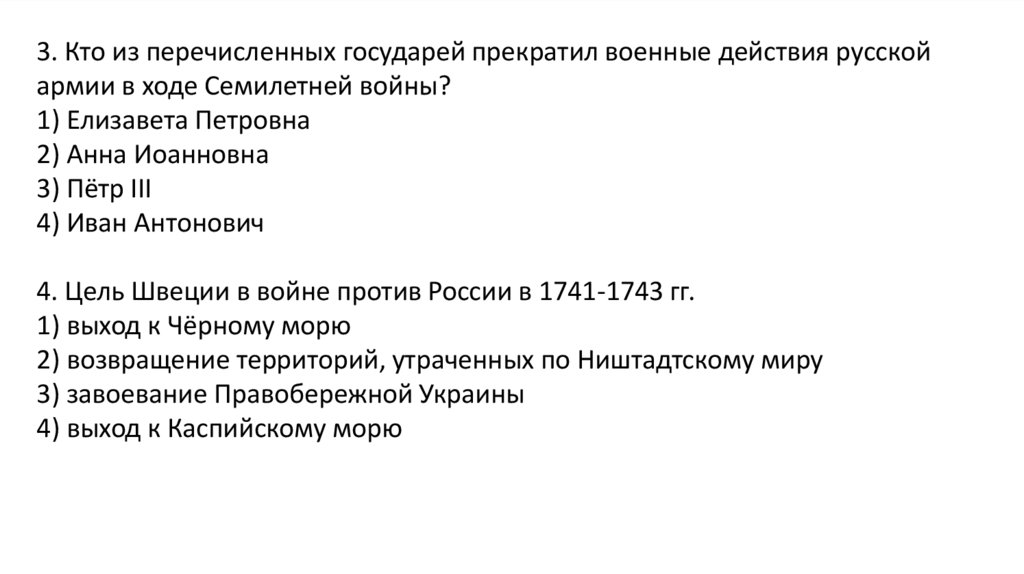 3. Кто из перечисленных государей прекратил военные действия русскойармии в ходе Семилетней войны?