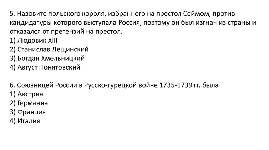 5. Назовите польского короля, избранного на престол Сеймом, противкандидатуры которого выступала Россия, поэтому он был изгнан из страны и