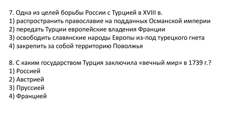 7. Одна из целей борьбы России с Турцией в XVIII в.1) распространить православие на подданных Османской империи