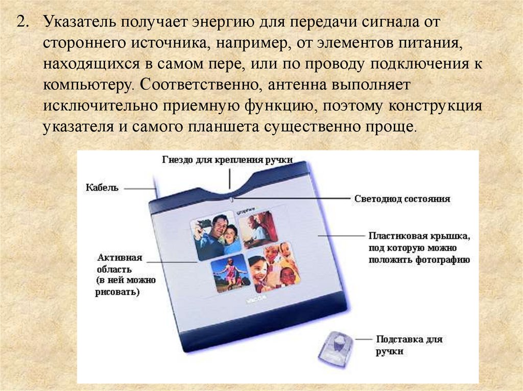 Принцип, лежащий в основе работы любого графическогопланшета, заключается в том, что специальное перо или ручной