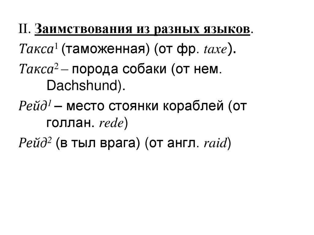 II. Заимствования из разных языков.Такса1 (таможенная) (от фр. taxe).