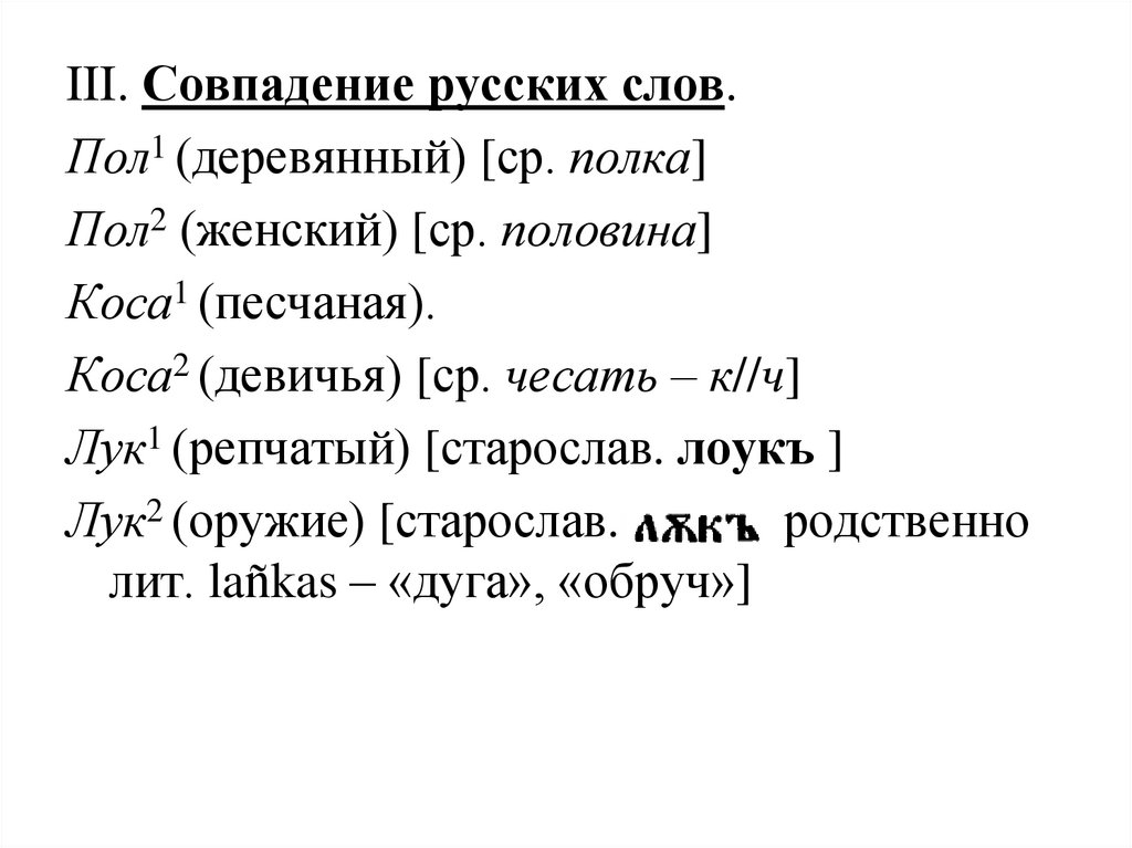 III. Совпадение русских слов.Пол1 (деревянный) [ср. полка]