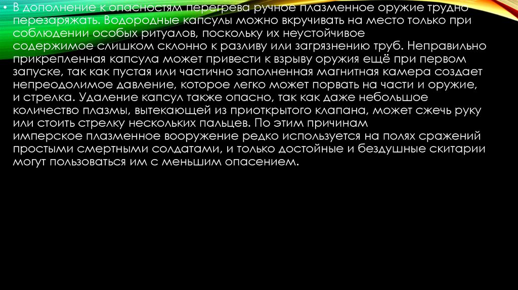 • В дополнение к опасностям перегрева ручное плазменное оружие трудноперезаряжать. Водородные капсулы можно вкручивать на место только при