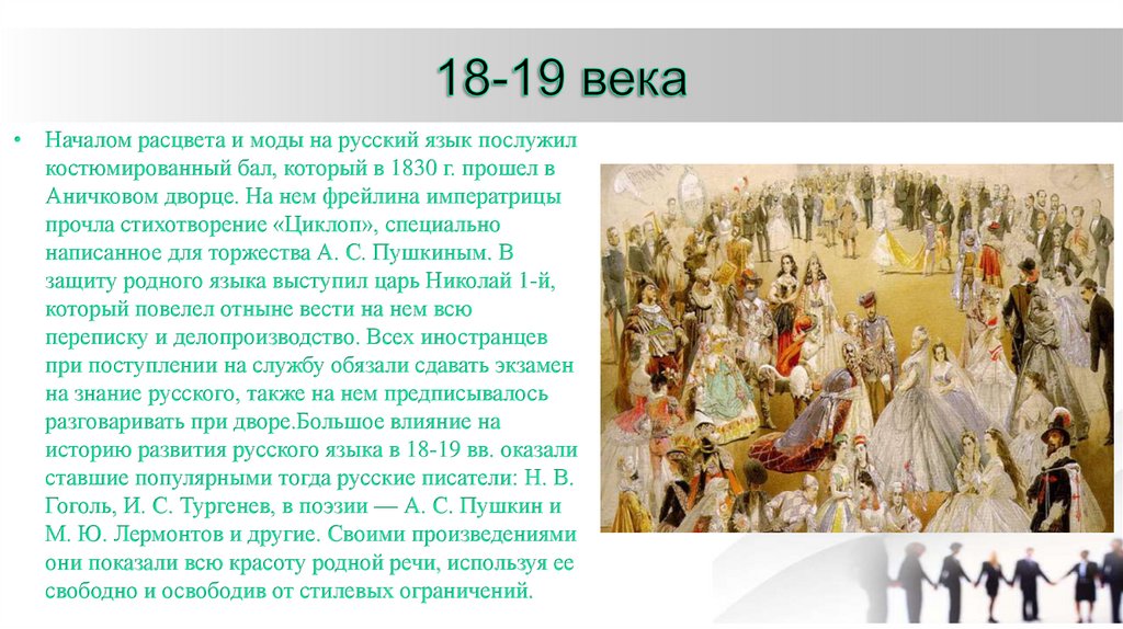 • Началом расцвета и моды на русский язык послужилкостюмированный бал, который в 1830 г. прошел в