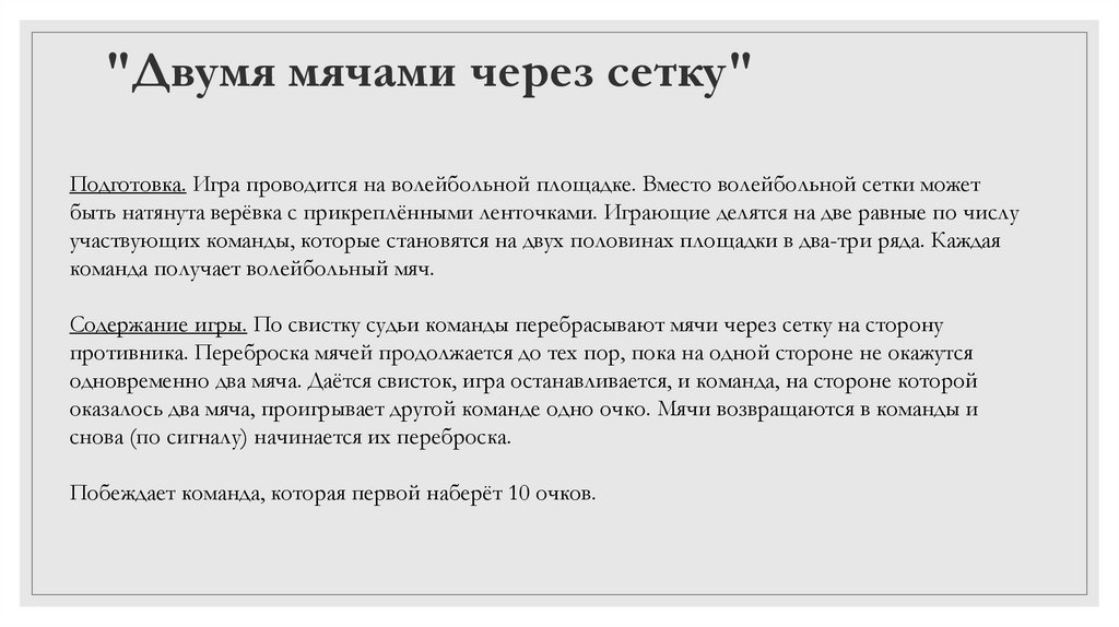 "Двумя мячами через сетку"Подготовка. Игра проводится на волейбольной площадке. Вместо волейбольной сетки может