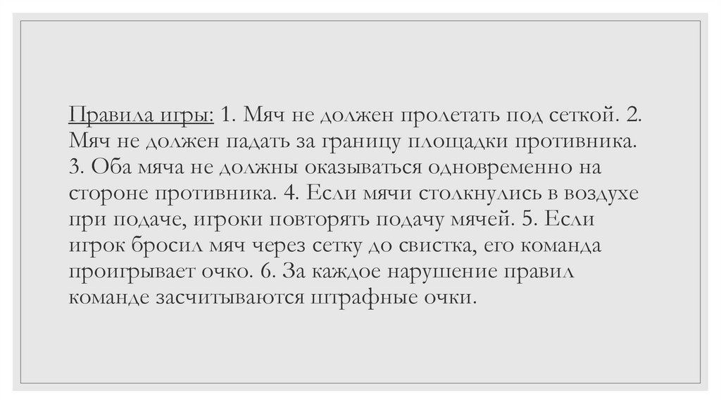 Правила игры: 1. Мяч не должен пролетать под сеткой. 2.Мяч не должен падать за границу площадки противника.