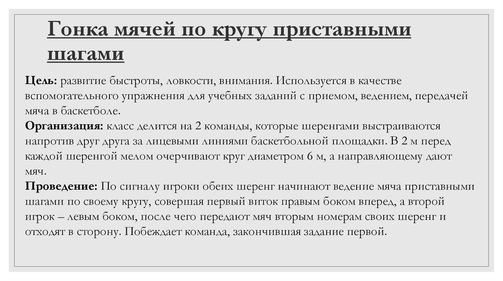 Проведение: По сигналу игроки обеих шеренг начинают ведение мяча приставными