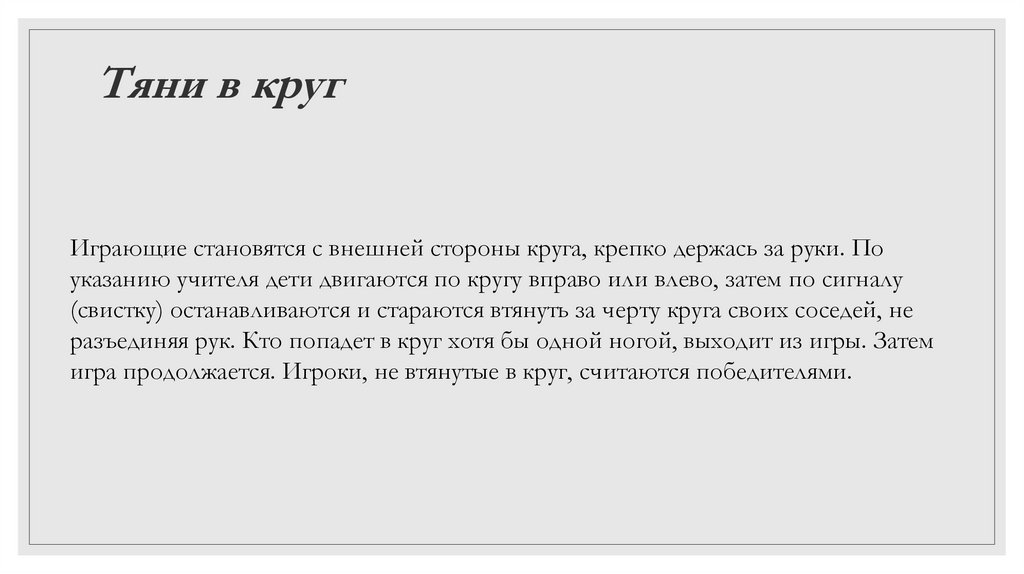 Тяни в кругИграющие становятся с внешней стороны круга, крепко держась за руки. По
