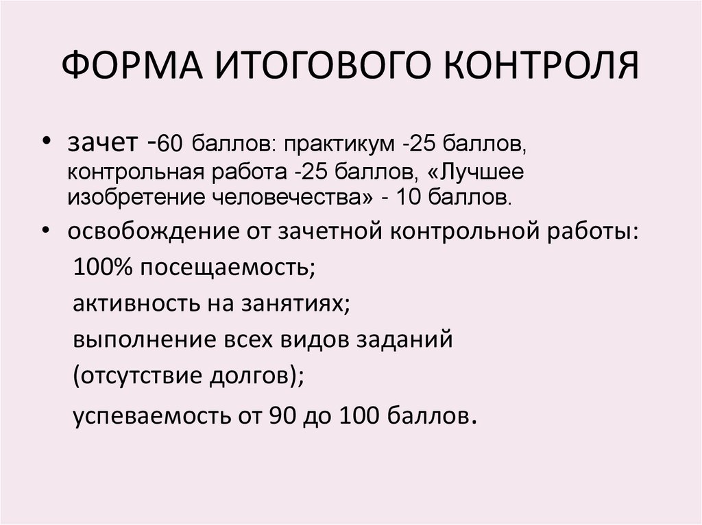 ФОРМА ИТОГОВОГО КОНТРОЛЯ• зачет -60 баллов: практикум -25 баллов,