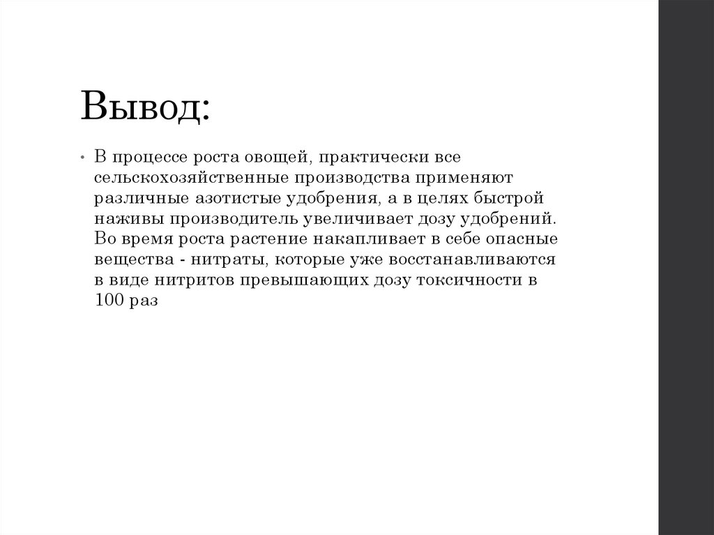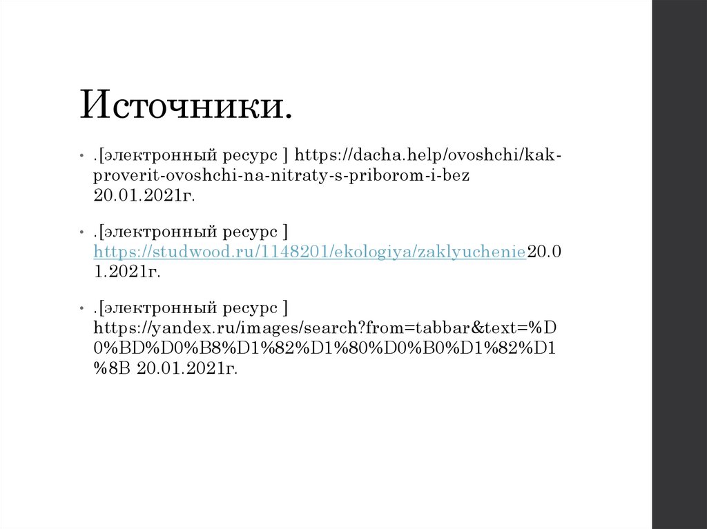 Источники..[электронный ресурс ] https://dacha.help/ovoshchi/kakproverit-ovoshchi-na-nitraty-s-priborom-i-bez