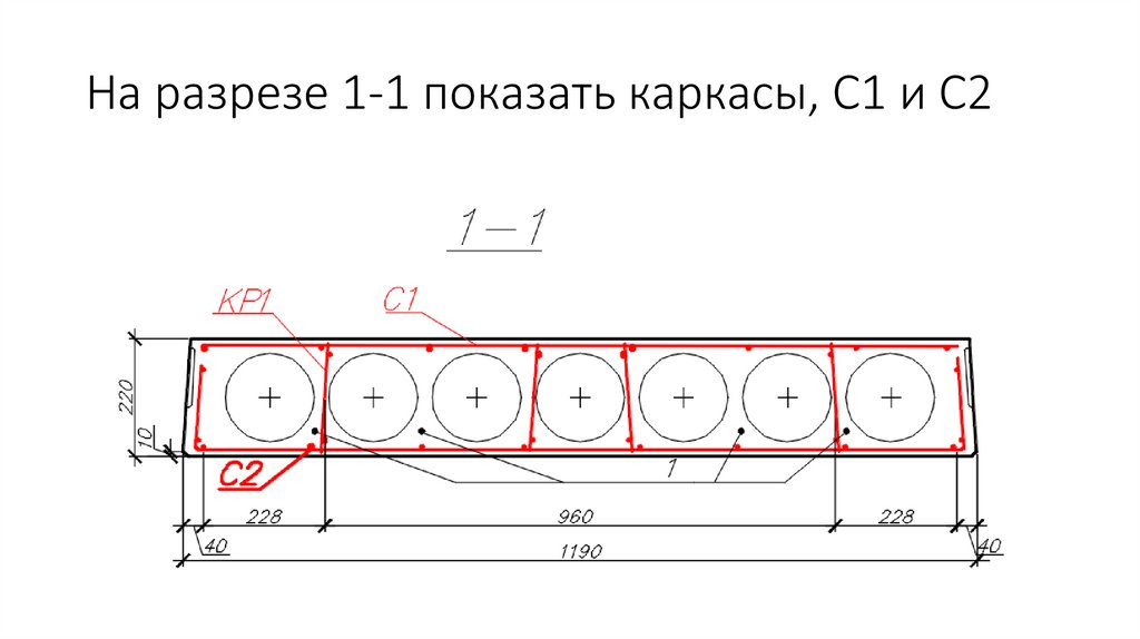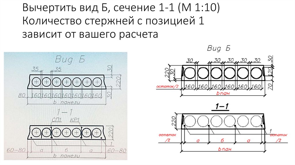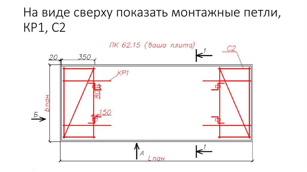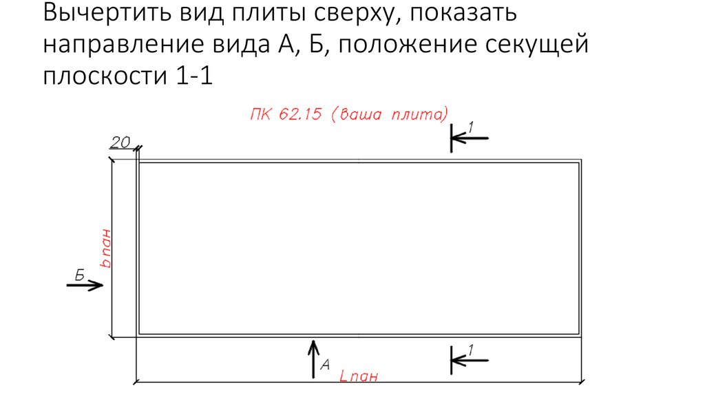 Вычертить вид плиты сверху, показатьнаправление вида А, Б, положение секущей