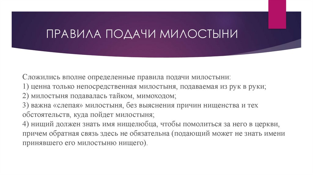 ПРАВИЛА ПОДАЧИ МИЛОСТЫНИСложились вполне определенные правила подачи милостыни: