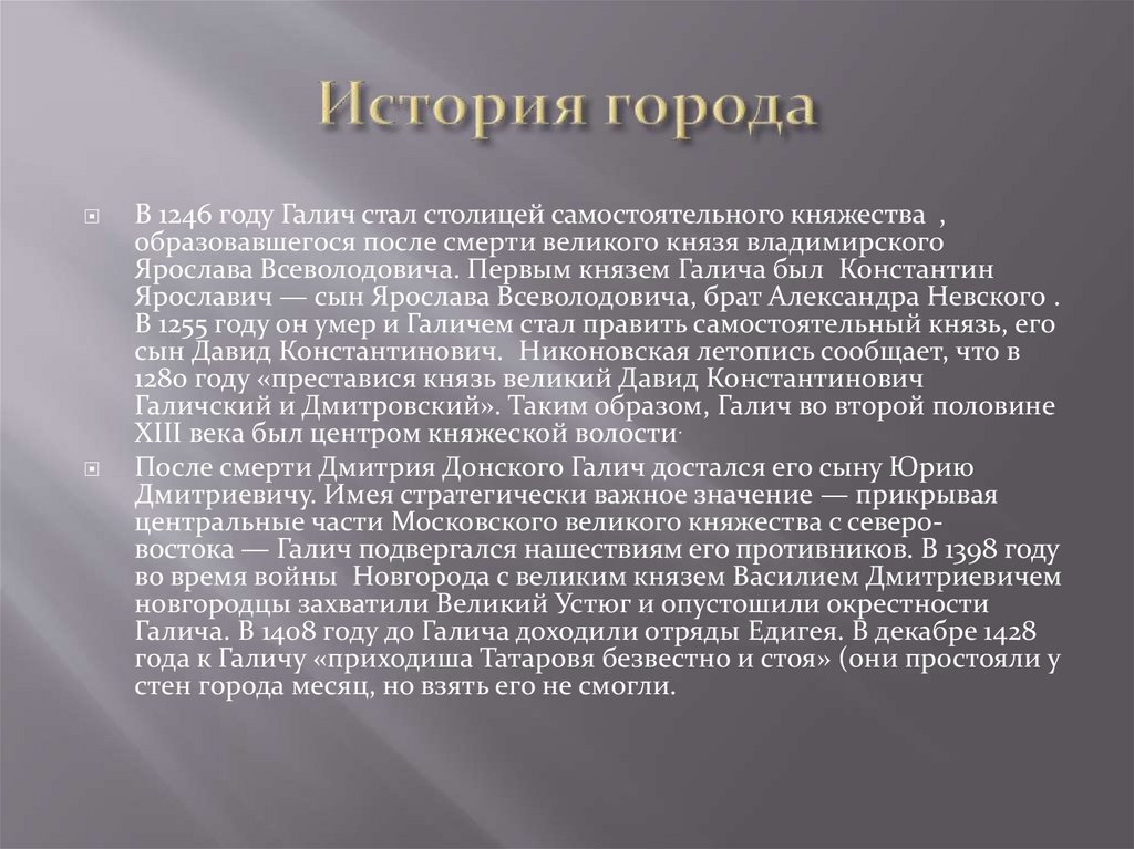 В 1246 году Галич стал столицей самостоятельного княжества ,образовавшегося после смерти великого князя владимирского