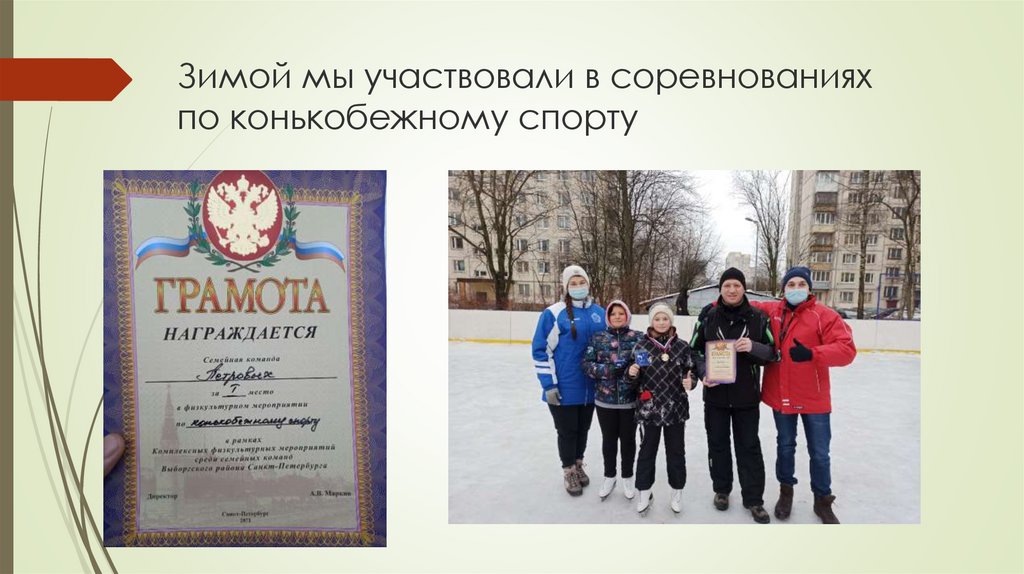 Зимой мы участвовали в соревнованияхпо конькобежному спорту